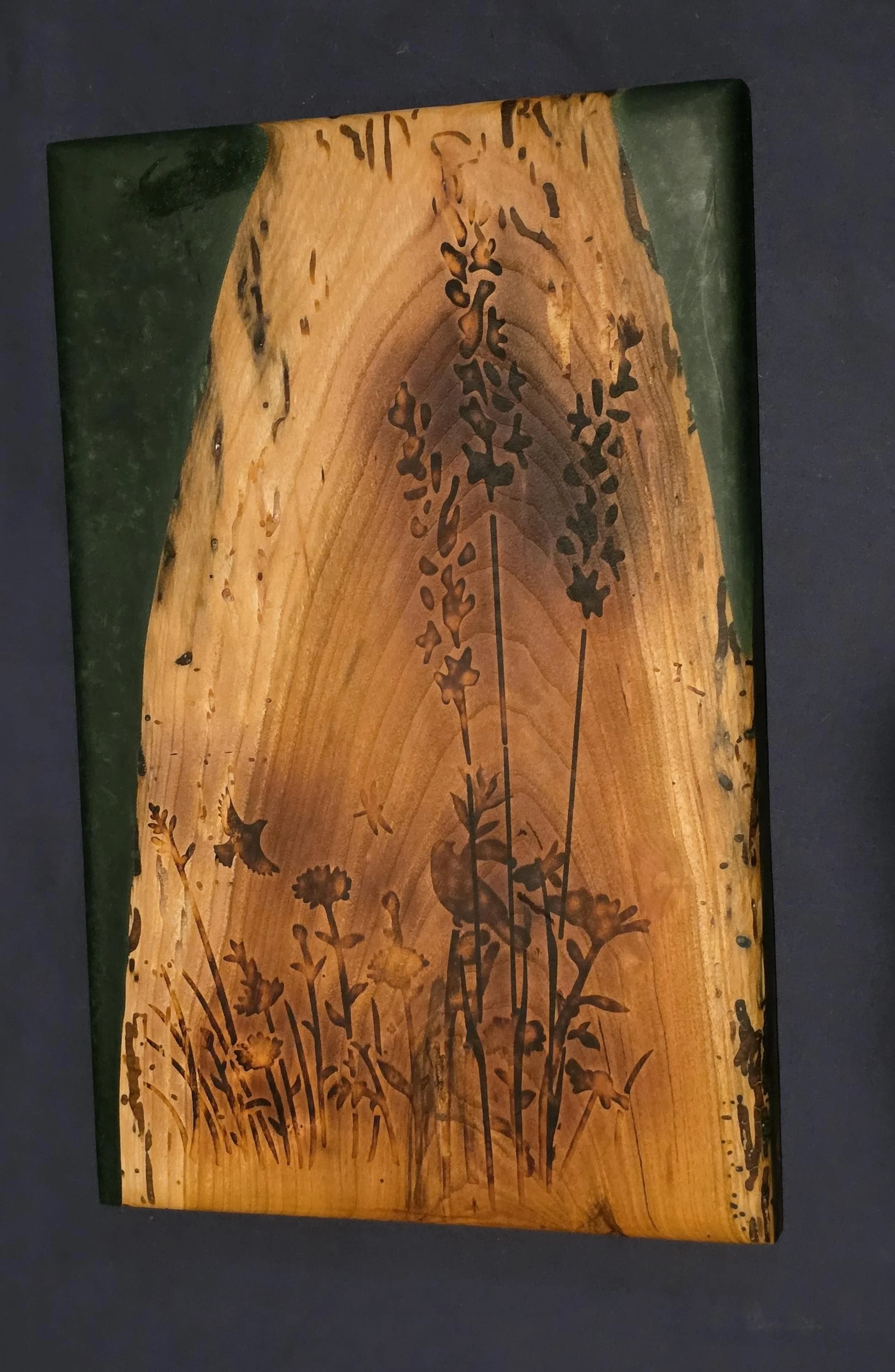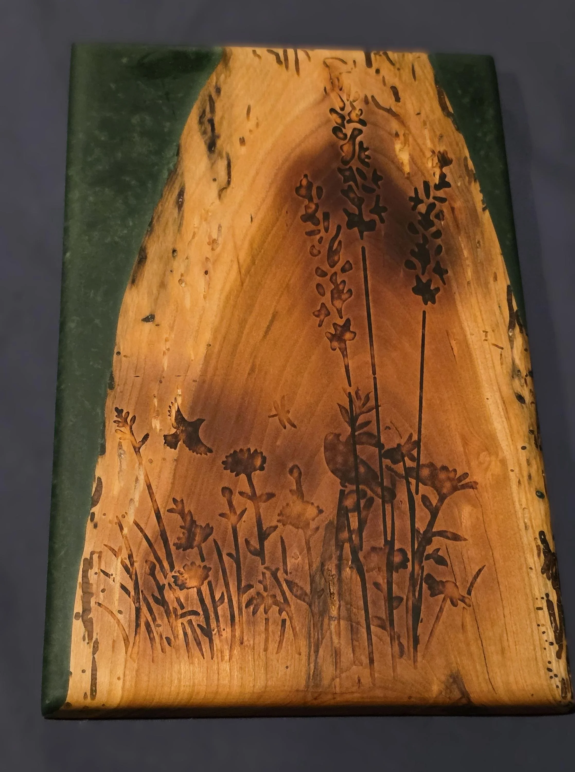 Crafted from a stunning slab of live-edge cherry wood, the board features a vibrant "Bonsai Green" mica epoxy inlay that mimics the lush depth of a forest floor. The heart of the wood is adorned with a detailed botanical scene of wildflowers and a bird in flight. This design was meticulously hand-applied using scorch paint and heat-activated to create a permanent, deep-burned silhouette that follows the natural soul of the wood.