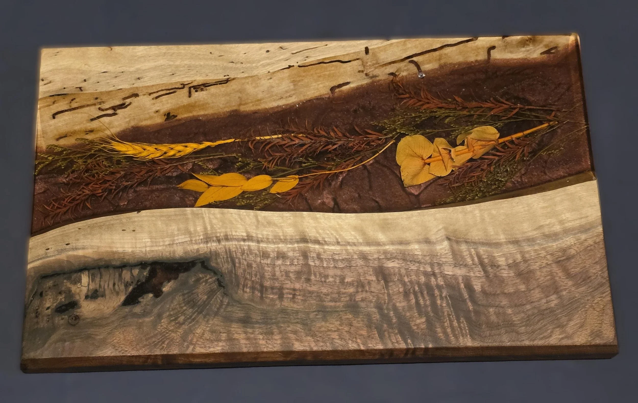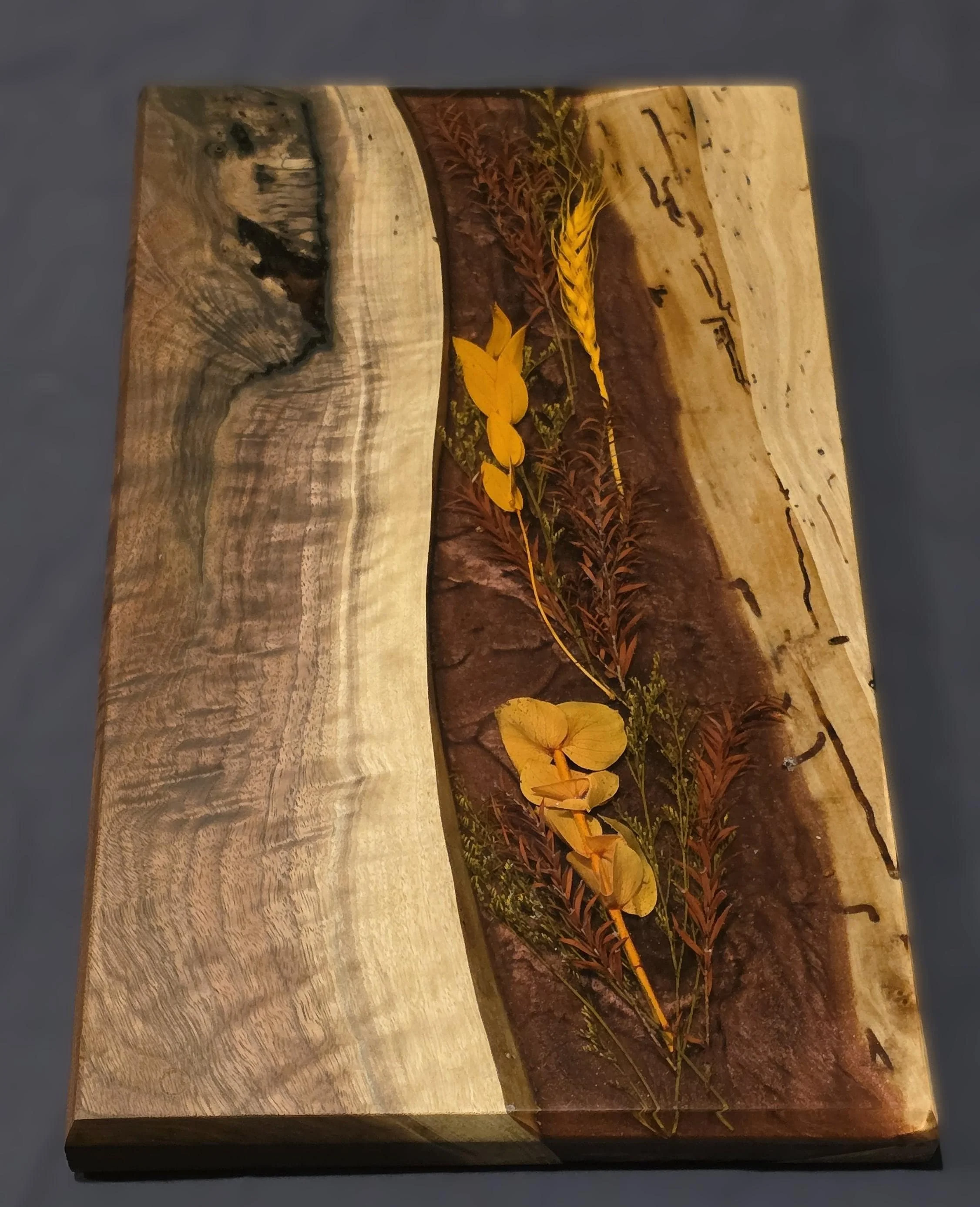 The center 'river' is a preserved botanical flowers, featuring a hand-selected arrangement of real dried foliage suspended in a translucent burgundy resin. Whether you're serving a spread of fine cheeses or displaying it as a kitchen centerpiece, this board is a guaranteed conversation starter.