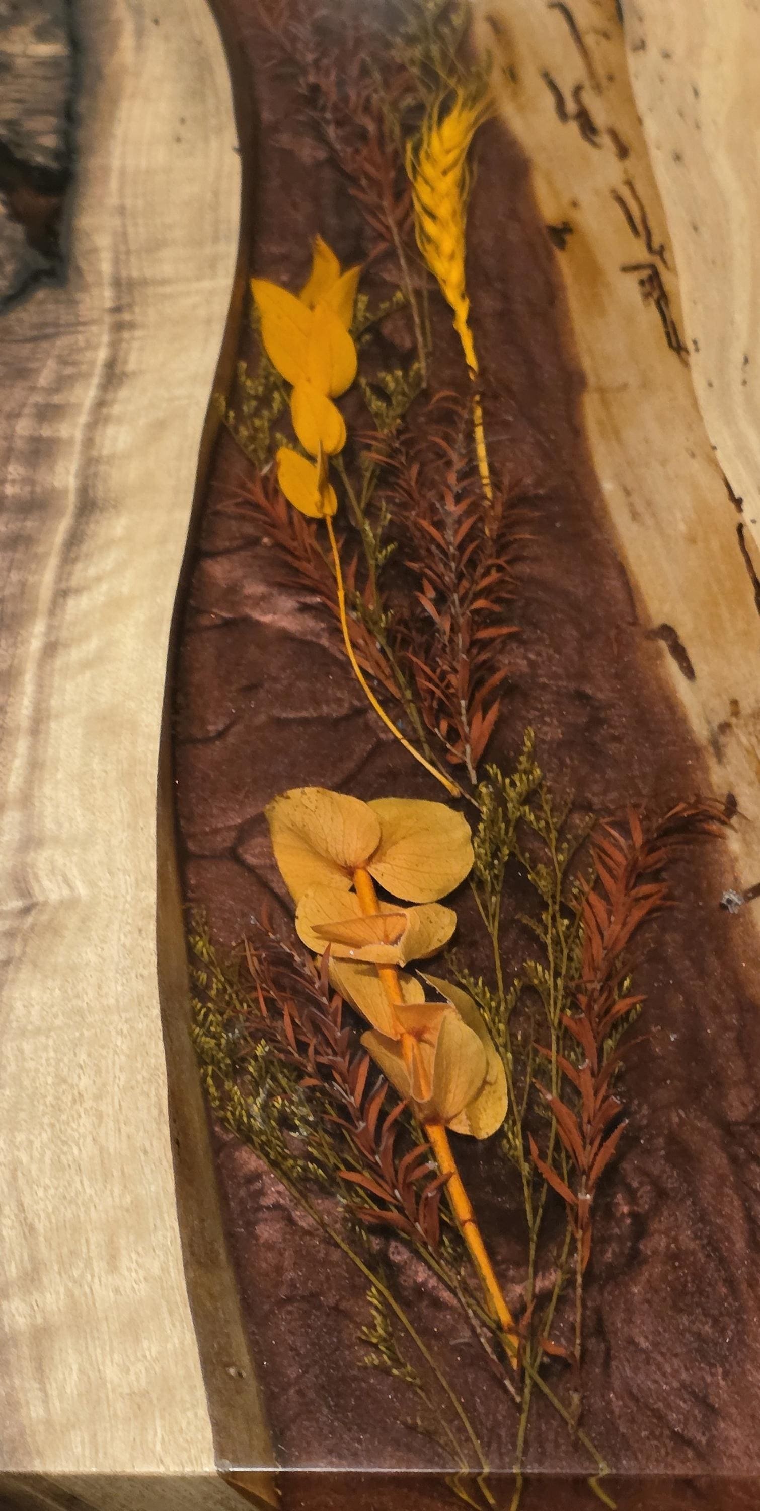 Materials: Figured Black Walnut, Food-Safe Epoxy Resin, Dried Botanicals